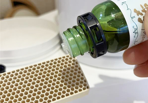 ハニカムセラミックスは、その名の通り、ハチの巣(ハニカム)の形のように正六角形が隙間なく並んだ構造になったセラミックプレート。多孔質の穴に稀を吸い込み、電子の風に乗せて香りを広げます。